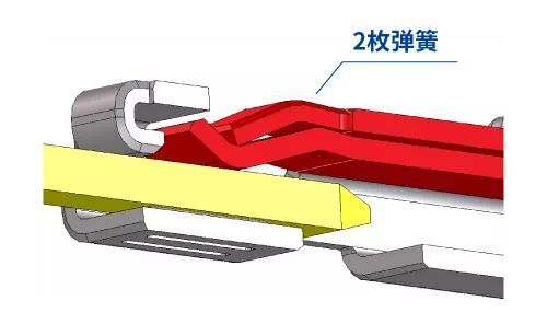 公端子采用2枚弹簧的结构。这比单片弹簧的接触力高,有抑制来自外部振动影响的效果。
