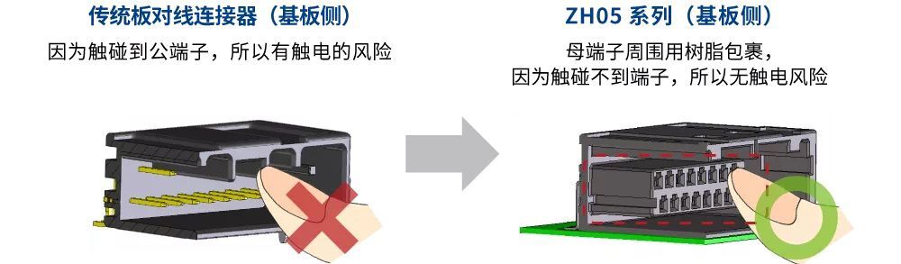 随着电池生产数量的增加对安全性的要求 一般监控车载电池电压等连接到带电部位时,使用棒状突出的公端子作为基板端的连接器。但是,现有的连接器端子形状会产生异物附在相邻端子之间,从而产生短路的风险。而且工作人员在进行插拔作业时接触到端子会有触电的风险。在世界范围内,随着向混合动力车和EV(电动汽车)转移的趋势,电池的生产数量不断增加,这也意味着风险的增加,那么安全对策就成为了当务之急。 创造性的结构,确保高安全性 为了满足这样的需求,“ZH05”在追求车载品质和防止触电这两点上进行了开发。板对线连接器采用箱型的公端子,用树脂将端子周围物理性包围使之绝缘,并实现了即便有异物进入也不会造成短路,工作人员不会触摸到端子的革新化的防触电结构。另外,采用了公端子独有的双弹簧结构,确保了适合车载内部连接使用的耐热性及耐振动性,从而完成了高可靠性的连接器。并且,由于在电池方面,电池的容量很重要,所以也追求其小型化,这就是“ZH05”。 防触电车载用板对线连接器“ZH05” (1) 基板端连接器的公端子周围用树脂包围的防触电构造。